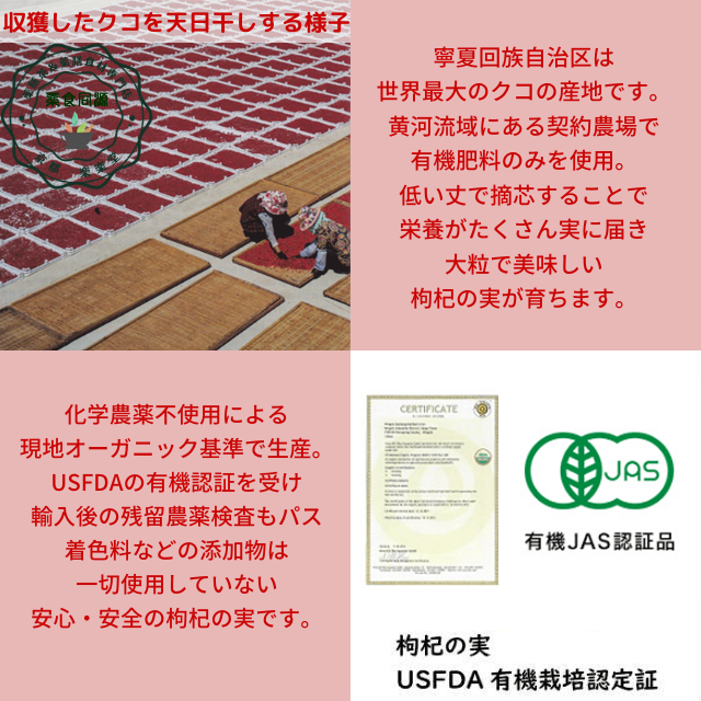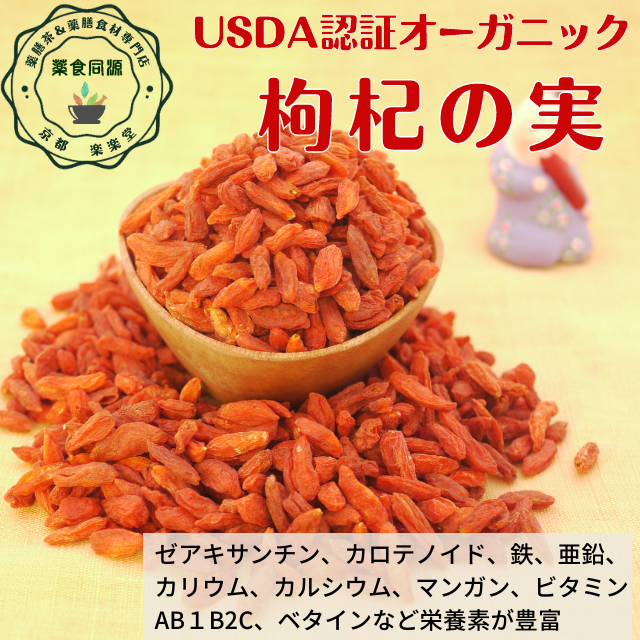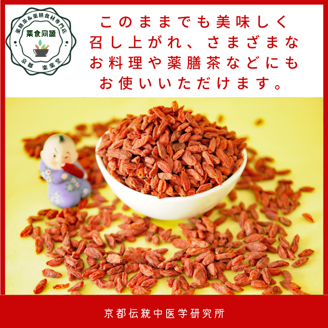 枸杞の実は滋養強壮作用があります。甘酸っぱくて口当たりの良い食べ物で、ドライフルーツとしてそのまま食べられますし、いろいろなお料理やデザートのトッピングやお茶やスムージーなどドリンクとしても召し上がれ、さまざまな活用が出来ます。